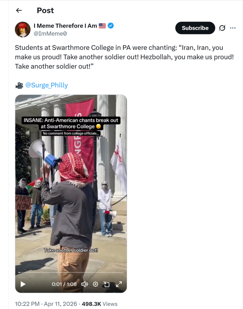 A recent rally at Swarthmore College in Delaware County demonstrates the depth of anti-American and anti-Israel sentiments across the region. Protestors were caught on camera, chanting, “Iran, Iran, you make us proud! Take another soldier out! Hezbollah, you make us proud.”